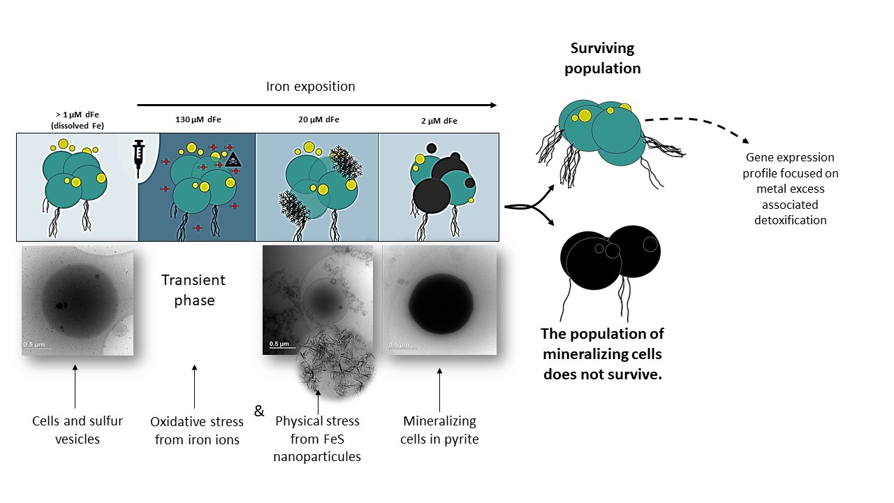 Thermococcales, hyperthermophilic archaea from hydrothermal vents, promote iron sulfide precipitation, enabling survival in iron-rich environments. Some cells become encrusted in pyrite and do not survive mineralization, while surviving cells activate metal detoxification genes
