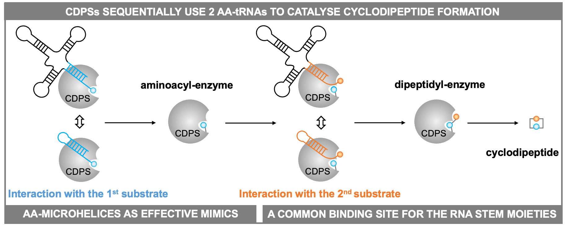 Cyclodipeptide synthases (CDPSs) utilize two aminoacyl-tRNAs as substrates to produce diverse natural products. Here, we demonstrate that CDPSs efficiently recognize aminoacylated microhelices (miHxs) that mimic the tRNA acceptor arm. Structural and enzymological analyses using unacylated, misacylated, and engineered miHxs reveal a shared RNA-binding mode for both substrates. These findings establish miHxs as versatile tools to investigate CDPS function and, more broadly, other aminoacyl-tRNA–dependent enzymes.