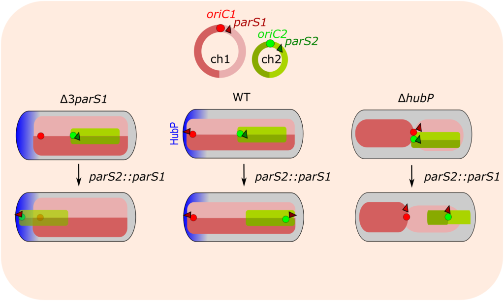 - The polar anchoring HubP involved in partition system of Vibrio cholerae chromosome I (ch1) is dispensable for an active positioning of ch1 replication origin but is required for the normal longitudinal organization of ch1.