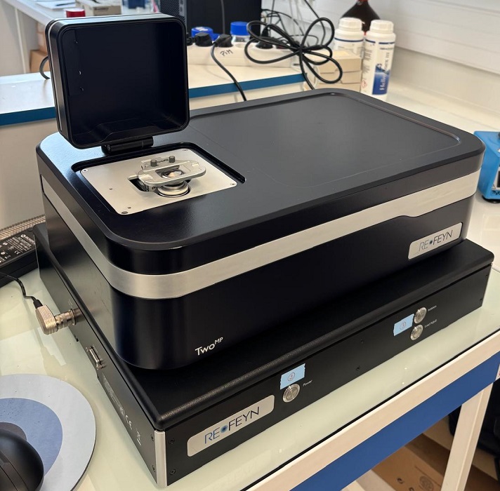 Mass Photometry (Refeyn): measures light scattering of single particles as they adsorb onto a glass microscope slide, and is used to rapidly determine mass, oligomeric state, and heterogeneity of a wide range of macromolecules and their complexes in solution, under equilibrium conditions and without the need for labels.